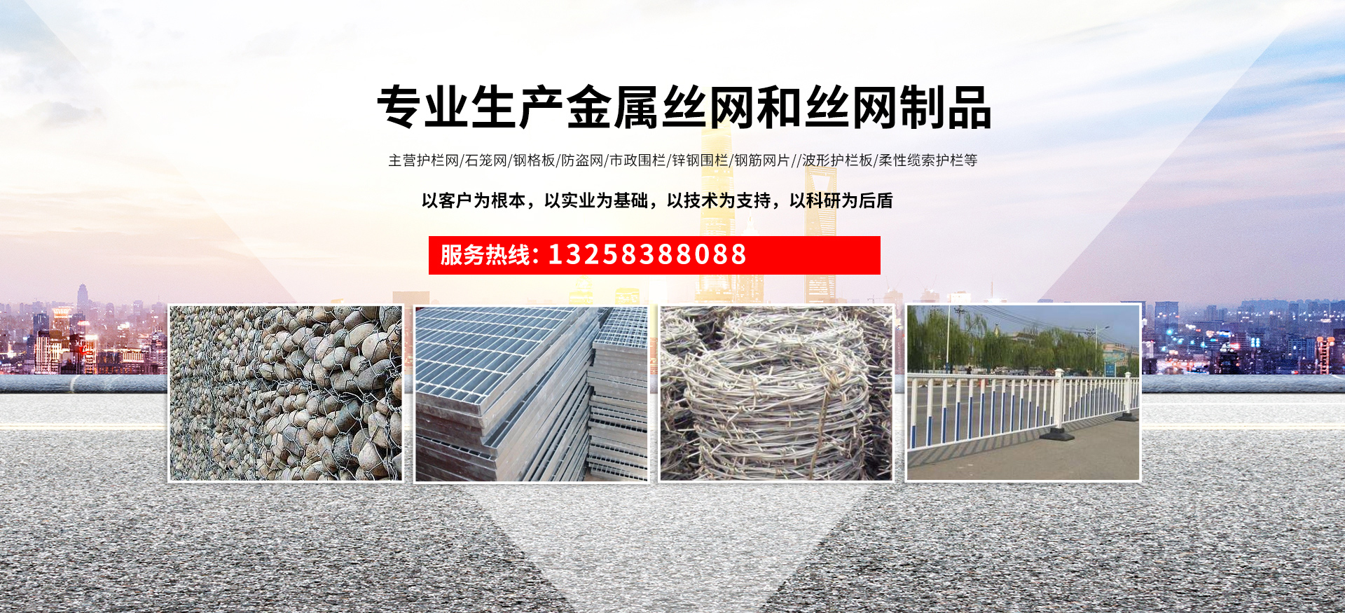 成都宏旭金屬絲網(wǎng)制造有限公司主營(yíng)護(hù)欄網(wǎng)系列、石籠網(wǎng)系列、鋼格板、防盜網(wǎng)、市政圍欄、鋅鋼圍欄、鋼筋網(wǎng)片、聲屏障系列、波形護(hù)欄板、柔性纜索護(hù)欄、SNS邊坡防護(hù)網(wǎng)等其他絲網(wǎng)類(lèi)產(chǎn)品。特殊規(guī)格可加工定做,也可根據(jù)客戶(hù)來(lái)圖來(lái)樣定做。自創(chuàng)業(yè)以來(lái),公司一直堅(jiān)持市場(chǎng)為導(dǎo)向,以客戶(hù)為根本,以實(shí)業(yè)為基礎(chǔ),以技術(shù)為支持,以科研為后盾,集科研、生產(chǎn)、經(jīng)營(yíng)為一體,不斷研制開(kāi)發(fā)新產(chǎn)品,開(kāi)拓市場(chǎng),走綜合發(fā)展之路。多年來(lái),公司憑借過(guò)硬的質(zhì)量,良好的信譽(yù)、優(yōu)質(zhì)的服務(wù)、合理的價(jià)格,贏得了市場(chǎng)和商家的一致好評(píng)。